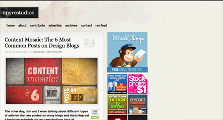 Spyre StudiosSpyre Studios hosts this fantastic overview of the six most common types of blog posts, and highlights the advantages and disadvantages of each. A great article for anyone currently growing their blog. Design Reviver2010 is now well underway, but this 2009 roundup from Design Reviver highlights some brilliant posts from last year. If you missed any of them, here’s your chance to catch up on the indespensible knowledge each article shares. VectorTutsThis in-depth tutorial from VectorTuts highlights some useful Adobe Illustrator techniques and shares the process of creating a curious owl character. Particularly, how gradients can be used to create depth and dimension. Web Design LedgerThis roundup of website navigation menus from Web Design Ledger provides some fantastic web design inspiration by showcasing a wide collection of various design styles and unique approaches. Fred DesignTypography is one of the core principles of a great design. This article on Fred Design takes a look at some simple rules that you should follow to inject your designs with good typography. What’s more, these rules can be spread across the whole spectrum of design, whether it’s for print or web. |