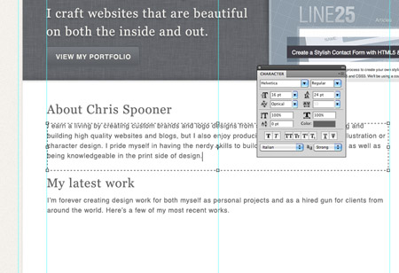 How To Build a Stylish Portfolio Web Design Concept Posted: 14 Mar 2011 12:00 AM PDT This tutorial covers part one of a multi-part series where we’ll go through the process of building a stylish design portfolio website. In this particular article we’ll create the visual concept and overall design concept in Photoshop, using various effects, blending modes and layer styles to create all the detailed elements of the design. The website we’ll be creating features a nice and clean layout and makes use of a contrasting header area to draw in the user. Otherwise the concept is styled with large typography and subtle details on the interface elements. Once you’ve finished your PSD concept, head over to my web design blog at Line25 to learn how to code up the design, then transform it into a fully working WordPress theme. View the portfolio web design concept Open up Photoshop and create a new document. I tend to work with dimension of 1680×1050 to gain an idea of how the website will look on a widescreen monitor. Fill the background with a light grey/cream and give 2% worth of noise from the filter menu. Right click and transform a selection to 960px, then draw guides to highlight the centre and each side. Use the rounded rectangle tool to draw a content area, but leave the edges around 10px short of the guides to allow for a Drop Shadow effect to be added. Paste in your logo in the centre of the design. If you fancy creating yourself a cool little emblem style logo like this, check out my old tutorial. Use the rounded rectangle tool to draw a small button in the header area. Change the blending mode to Overlay to allow the underlying texture to show through. Add a very subtle Inner Shadow to give the impression of an inset appearance. The key is to turn the opacity right down to around 10%. Make copies of the button to either side of the logo, then add text to each navigation item. Typical pages might be home, about, portfolio and contact. CMD+click the thumbnail of the of the white content area, then ALT-drag across the lower portion with the marquee tool to leave a shorter selection. Fill this area with black. Load the layer styles window for this layer and add a Pattern Overlay. Here I’m using an iPhone 4 style fabric texture from Dr.Palaniraja. Draw a thin 4px border across the bottom of the header area and give it a light grey fill. Use a black to transparent gradient to draw a small shadow along the bottom edge of the header. Tone down the opacity to around 10%. Use the Georgia font to add a stylish introductory title to the header area. Add a touch of tracking to space out the letters slightly. Draw a button shape using the rounded rectangle tool, then use the layer styles window to begin sprucing it up. Begin with a gradient using a dark and light grey sample from the header background. Give the button a beveled appearance by manipulating an Inner Glow into a thin light grey border, then add a 1px dark grey Stroke. Finish off the button with a line of text and adjust the settings of the Drop Shadow effect to create an inset appearance. Paste in a sample of your website design work in the header. Make a selection from the header area then add a layer mask to trim the screenshot to size. Add a Drop Shadow using Photoshop’s layer style effect then right click and select Create Layer. Use the Warp function of the transform feature to bend the shadow outwards. Lower the opacity to give a more realistic appearance. Use the typography from the header titles on headings in the main content area and write out the main body copy with a nice large sans-serif font. Draw a grey rectangle as the base of a portfolio item preview, then give a rounded rectangle an Inner Shadow to create a subtle button element. Finish off the portfolio item with a thumbnail with the project being showcased, then add a text link using the font styling from the navigation menu. Group and duplicate the elements that make up the portfolio item then swap out the thumbnails to showcase your latest work. Finish off the footer area with a copyright notice and back to top link. The main home page concept is now complete, so let’s flesh out the inner pages. Duplicate your PSD and rename it to ‘About’. The inner pages don’t need a large header area, but we can use the space to display the page title. Trim the header area down in size. Adjust the text in the header to introduce the page. In this case the About page can be titled ‘About Chris Spooner’ – Or it might be a good idea to use your own name. Paste in your body copy to fill out the about content area. Don’t forget to leave space to display a picture of yourself! The Portfolio page can be constructed by duplicating the portfolio items and replacing the thumbnail for each of your design projects. Fill out the page with a selection of portfolio items. When we eventually build the website as a WordPress theme, each portfolio item will be created as a blog post. Use a range of rounded rectangles to lay out a typical contact form for the contact page, then list out your favourite social website along with icons. Don’t forget to stop by over at Line25 to learn how to take your PSD concept and turn it into a fully working HTML and CSS website. See part 2 of the tutorial: Coding in HTML & CSS |